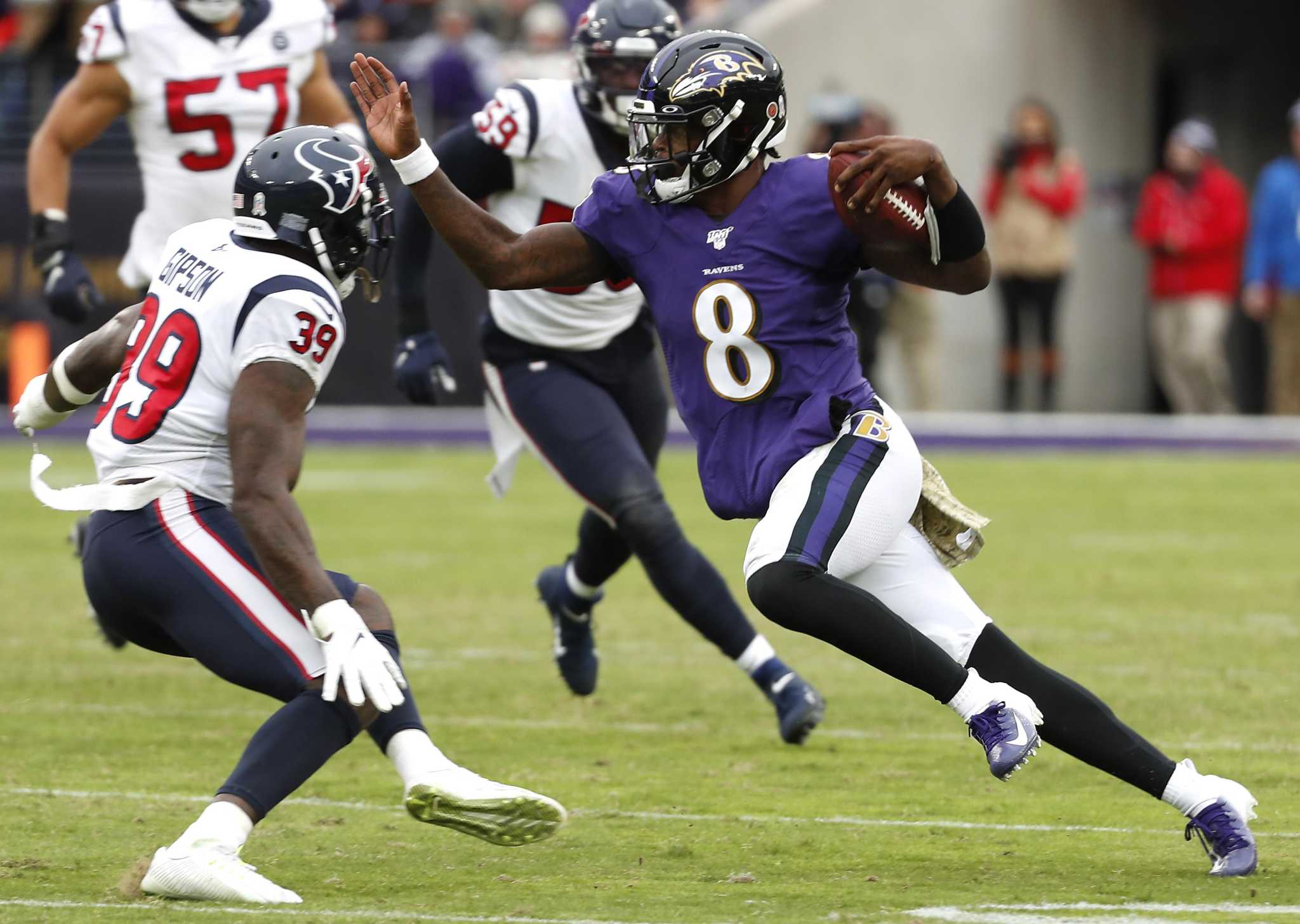 The NFL Most Valuable Player rapidly dodged flailing, diving tackle attempts from outside linebacker Whitney Mercilus and defensive end Charles Omenihu at the line of scrimmage. Jackson scampered into the open field with speed and moves so potent it hearkened back to Michael Vick’s heyday. His acceleration and cuts led to cornerback Lonnie Johnson Jr. and nose tackle Brandon Dunn violently crashing into each other in pursuit.