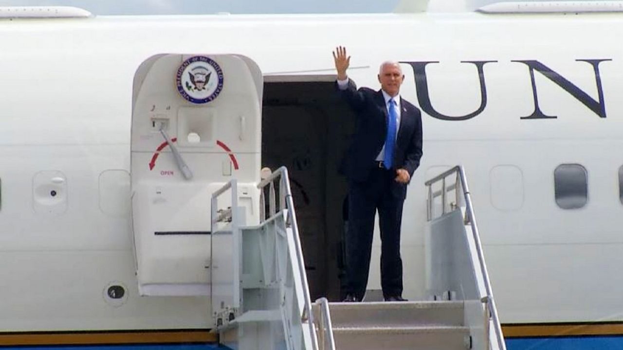 ORLANDO, Fla. — Air Force Two may have been about half an hour late, but it arrived at the Orlando International Airport Saturday afternoon, carrying Vice President Mike Pence as he entered the battleground state of Florida for two campaign stops, his first such appearances since the White House coronavirus outbreak.