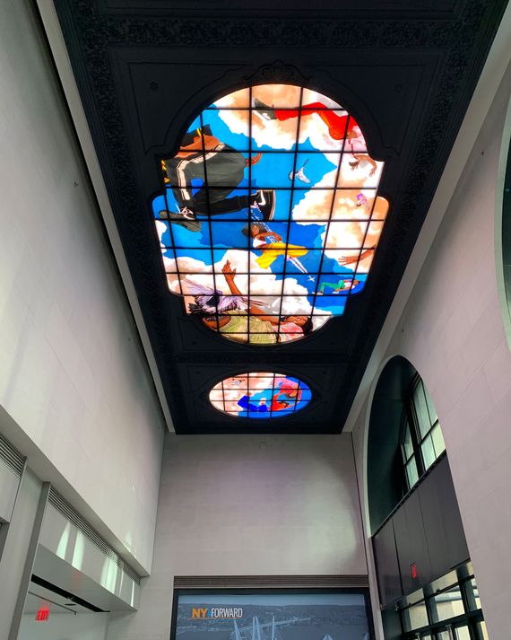 But competing with one of New York’s most beloved architectural nodes is like rewriting Moby-Dick: the comparison is unlikely to be flattering. Grand Central is inviting, harmonious, soothing even in moments of frenzy. Moynihan self-consciously tries to reconcile old-timey graciousness and contemporary cool, muted stone and garish screens. Just inside the 33rd Street mid-block entrance, a stained-glass painting by Kehinde Wiley, framed as to fit in a Renaissance palazzo, glows from the ceiling. Black dancers cavort among the clouds with New York pigeons and a passing jet. The foyer spills out into a glass-vaulted passageway between the ornate 1914 original building and the plainer annex, built two decades later. From there, passengers move down an escalator and into a corridor, where an abundance of metal panels, stainless-steel handrails, glass railings, and a palette ranging from pewter to graphite gives the space a sober, gray-suited air. Only in a waiting room designed by the Rockwell Group does a splash of warmth relieve the austerity. There, sinuous walnut benches and wainscoting snake among gray columns, walls are tiled with white-on-blue architectural drawings of trusses and arcades, and a set of photo illustrations by the artist Stan Douglas re-create incidents from Penn Station history in epic style.