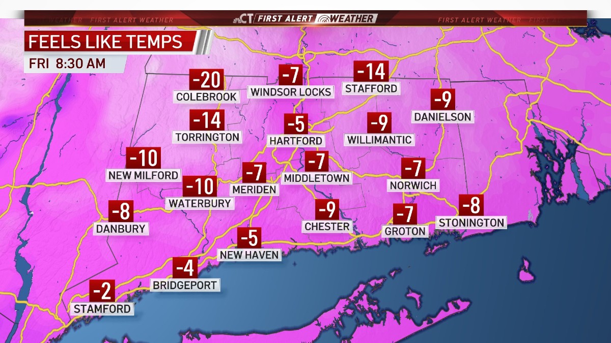 Wind chills will drop below zero by Friday morning. High temperatures will be between 15 and 20. The "feels like" temperature will range from -10 to -20 for much of inland Connecticut early Friday morning.