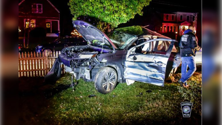 An officer tried to conduct a traffic stop after encountering the erratic driver when police say he fled and continued onto Main Street in Scituate where he crashed into a tree and came to a stop in a front yard on Country Way.