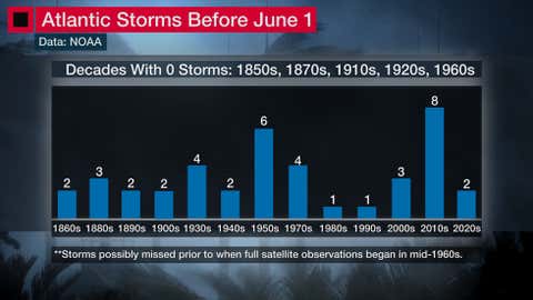 According to NOAA's database, 40 storms formed in the Atlantic Basin before June 1 from 1851 through 2020, a long-term average of one such early storm every four to five years.