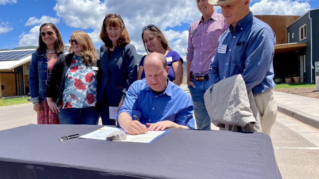 Dozens of people gathered at the construction site of Basalt Vista, the affordable housing project being built in partnership between Pitkin County, the town of Basalt, Roaring Fork School and Habitat for Humanity, to commemorate the governor signing two bills — the Department of Local Affairs Innovative Affordable Housing Strategies and Expand Broadband Service — into law.