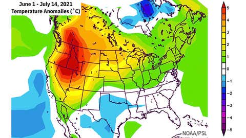 Temperature departures from average from June 1 through July 14, 2021, in degrees Celsius. Areas most anomalously hot in this period were in southwest Canada, the Great Basin and northern Rockies.