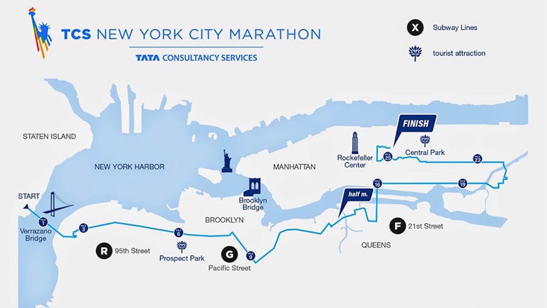 The runners will race through the five boroughs of New York City throughout their 26.2-mile race on Sunday. The runners begin in Staten Island at the Verrazzano Bridge before making their way to Brooklyn, Queens, Manhattan, the Bronx before circling back and finishing in Manhattan. The finish line is located in Central Park.