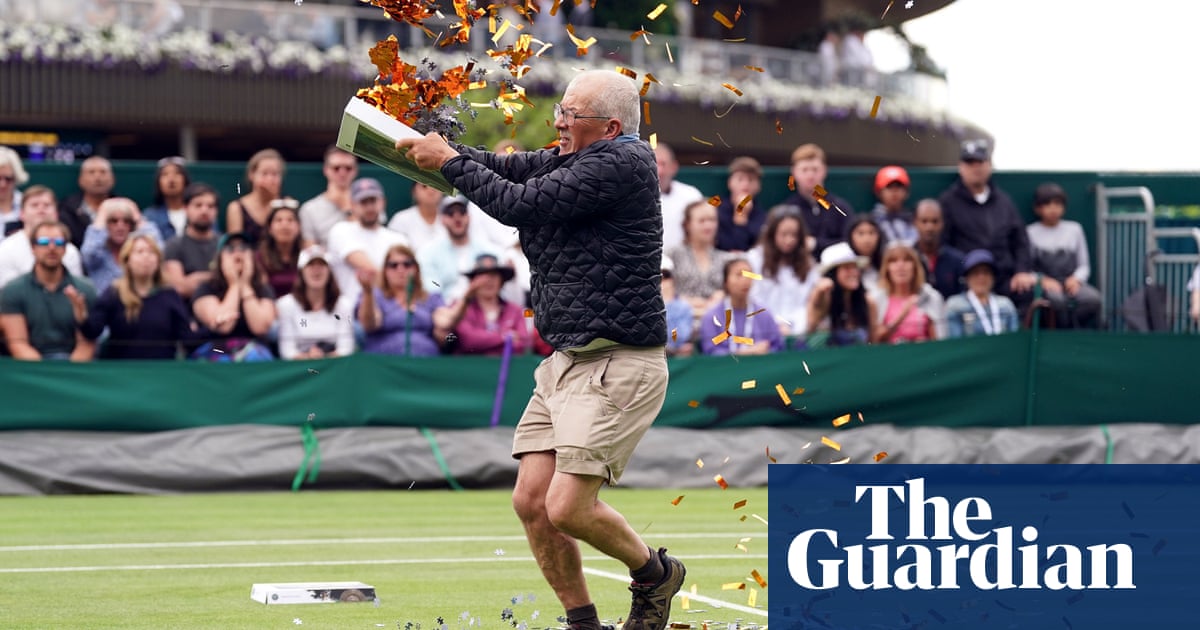 A Met police spokesperson said: “At around 14:08, a male and female member of Just Stop Oil ran onto Court 18 during a match and discharged what is believed to be orange paper petals and jigsaw pieces. Both were detained by Wimbledon security before being arrested by Met officers on suspicion of aggravated trespass and criminal damage.